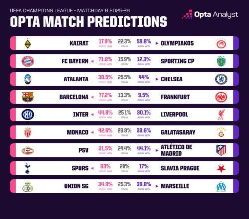 不过国际米兰本赛季也有“遇强难胜”的毛病,上一轮欧冠就是在客场1比2输给了马德里竞技。再考虑到利物浦或许也有触底反弹的可能,国米也只是被“谨慎看好”。据Opta超级计算机模拟推演,意甲蓝黑的获胜概率达到44.8%,而利物浦则为30.1%,差距其实不算很大。同样是今晚登场的豪门球队中,拜仁慕尼黑和巴塞罗那则都被算出了超过70%的获胜概率,看起来分别拿下里斯本竞技和法兰克福似乎不在话下。